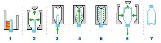 其加工流程如下:PET/PP原料除溼乾燥->以射出機將熔融原料射入模具->PET/PP瓶胚冷卻成型->以拉伸吹塑成型機(Stretch Blow Molding)進行雙軸延伸吹塑成型。
